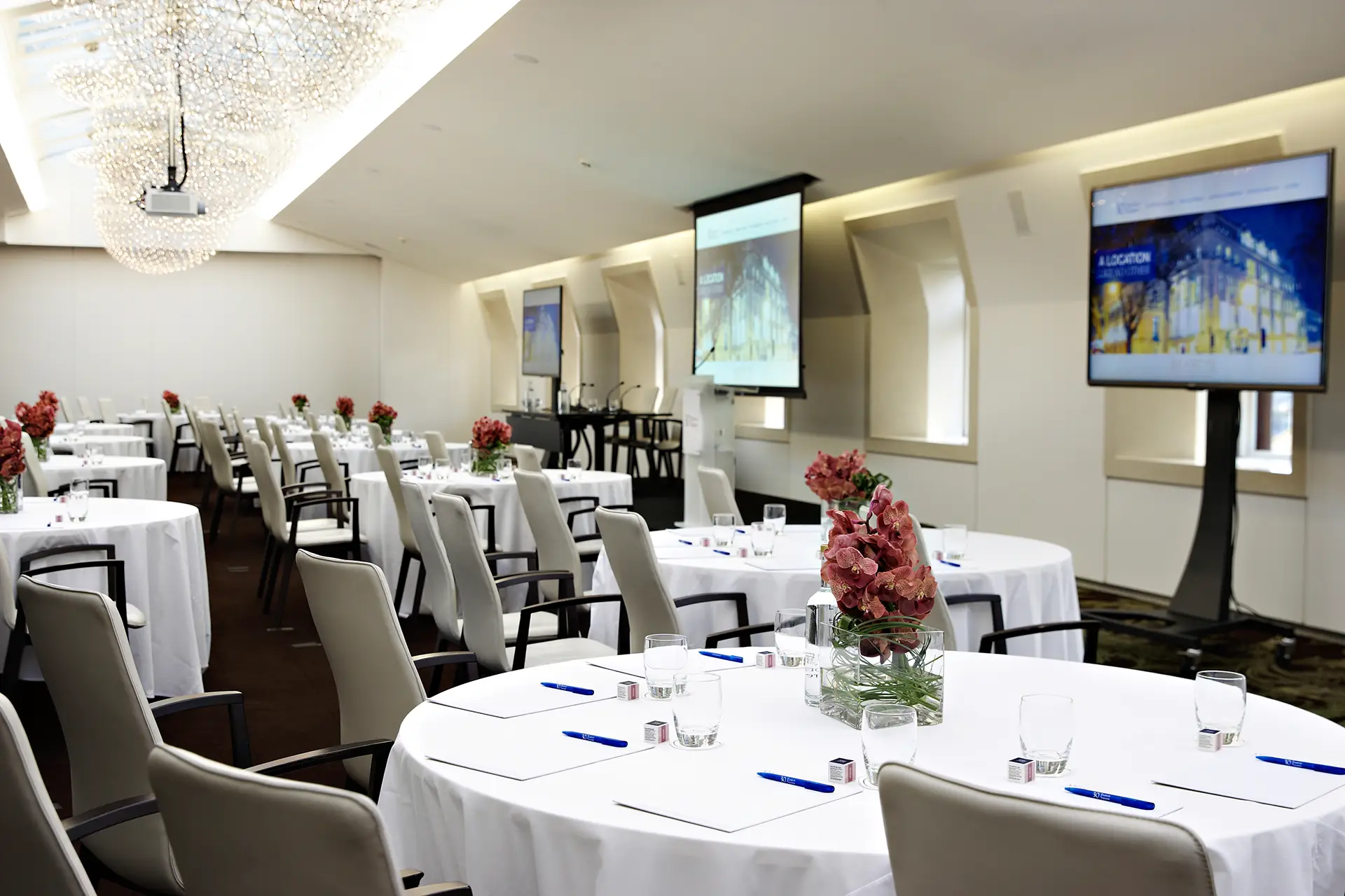 The Euston Room, the larger of the two State Rooms, accommodates up to 160 guests and is a favourite for conferences private dining and special occasions. With 268m² of space, it offers flexibility with two screen locations, portable staging, and a built-in PA system. Advanced AV equipment, including a projector, large flatscreen TVs, and high-speed WiFi, ensures seamless presentations and speeches. The room features an elegant atmosphere enhanced by a stunning skylight and sophisticated ceiling lighting, creating a refined and inviting ambiance for any event.