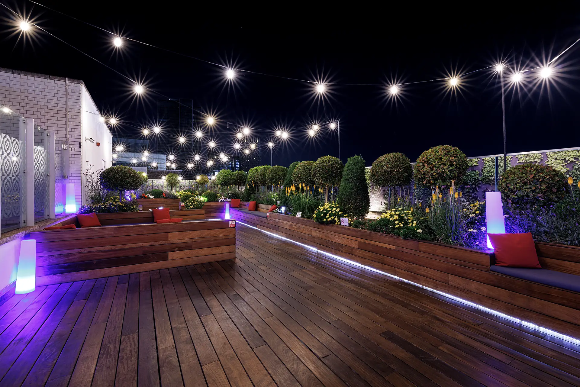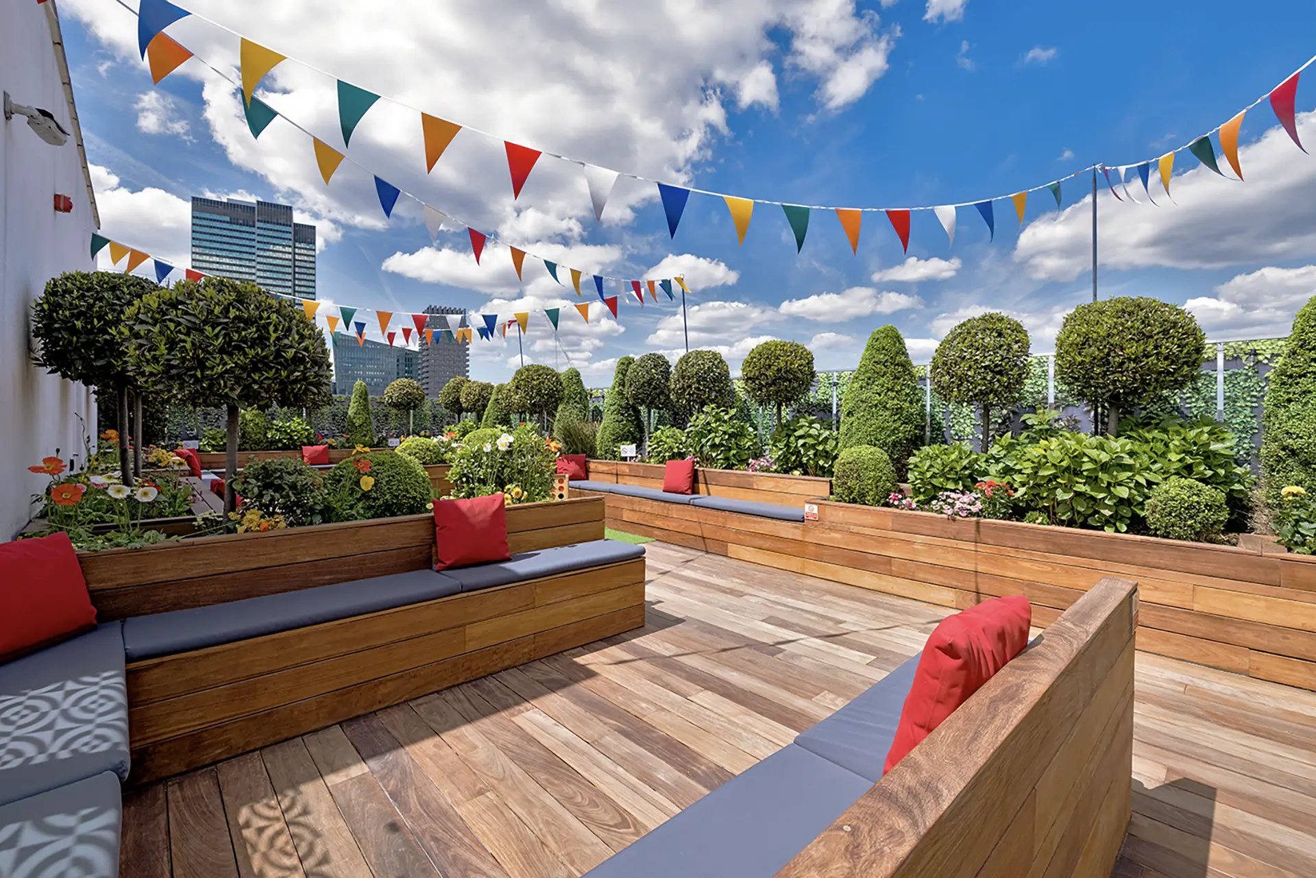 Our Rooftop Terrace, with wooden decking, comfortable seating, and integrated AV, offers stunning views of the city. With a capacity of 90, it’s ideal for networking, parties, or as an additional breakout area for both summer and winter functions. Guests can enjoy the cityscape, top-quality Bose speakers, and even a BBQ. The terrace is partially covered, making it a great option year-round, regardless of the unpredictable British weather. Combined with the Euston and Stephenson Rooms, this outdoor space creates an unforgettable experience for any event in central London.