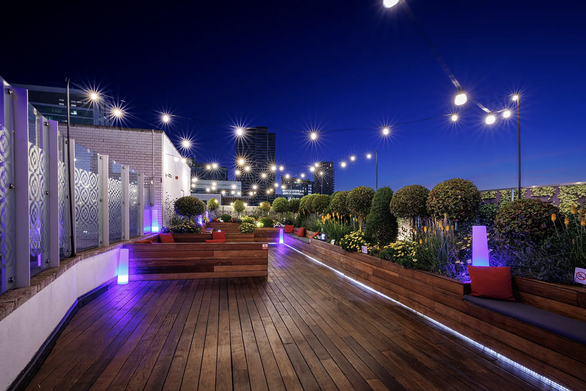 With wooden decking, cosy seating, and built-in AV, it’s a versatile, partially covered outdoor space for up to 90 guests.